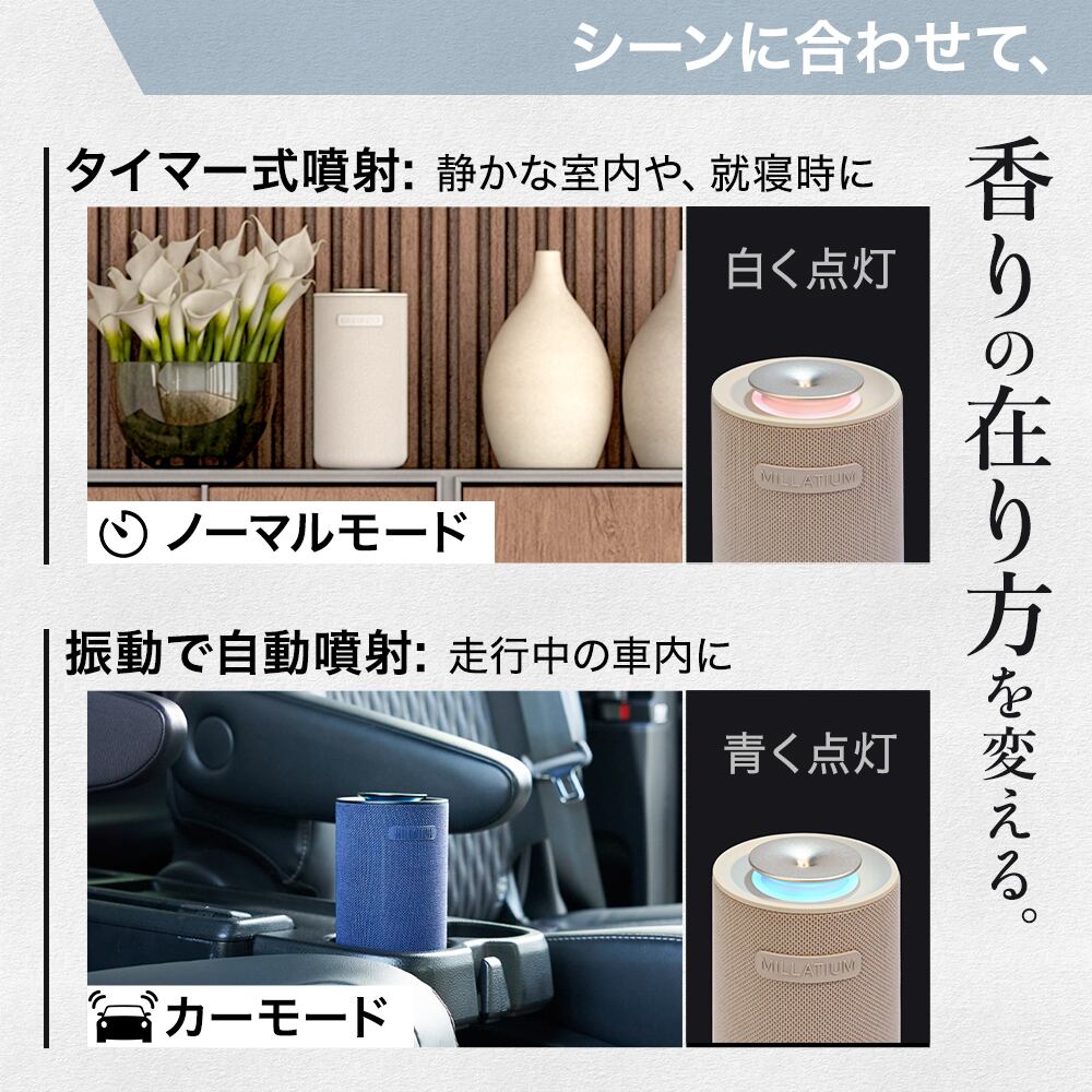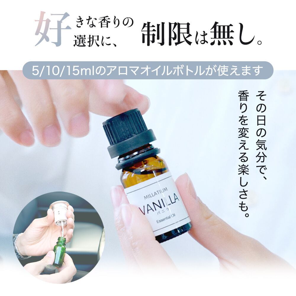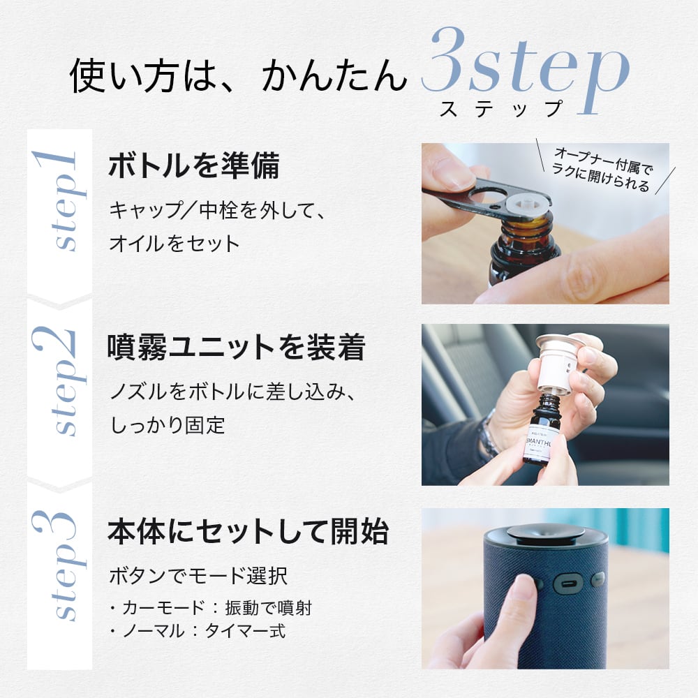 【香りを2段階調整・精油ボトルそのまま装着】 シーンや気分に合わせて「濃いモード(噴射10秒/休止20秒)」と「穏やかモード(噴射10秒/休止40秒)」を切り替え可能。 市販の5ml/10ml/15mlサイズの精油ボトルに対応しており、10mlの精油オイルが1本付属します。 また、付属のキャップオープナーを使えば、精油ボトルのキャップの着脱も簡単。購入後すぐにお好みの香りをお楽しみいただけます。