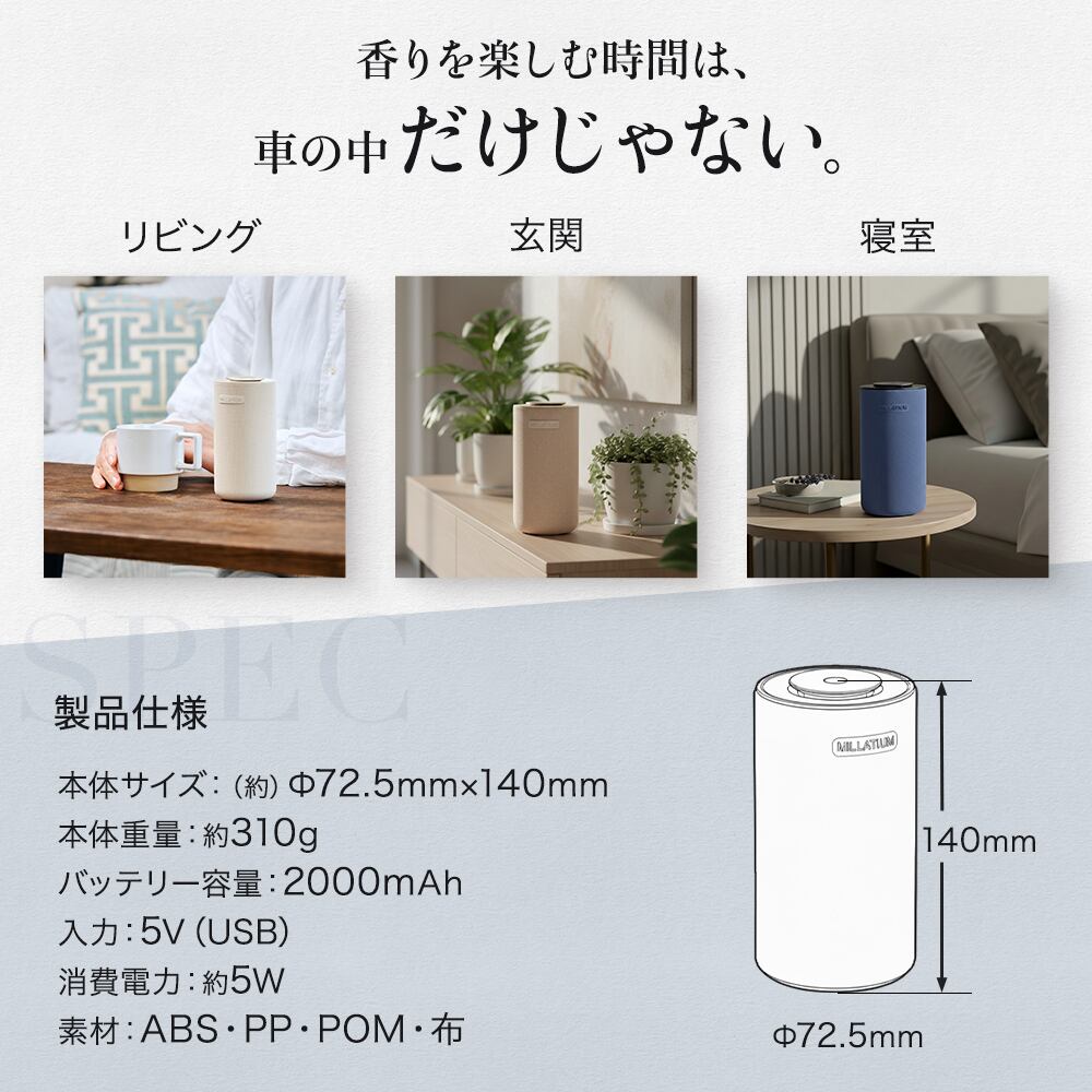【USB充電・コードレス仕様でどこでも芳香空間】 USB充電式のワイヤレス設計で、車のカップホルダーにもすっきり収まるコンパクトサイズ。淡いモードなら最大約10時間稼働し、約46㎡(約500平方フィート)まで香りを広げます。動作音はわずか約32dBと静かで、車内、寝室、オフィスなど、あらゆる場所で快適に使用できます。